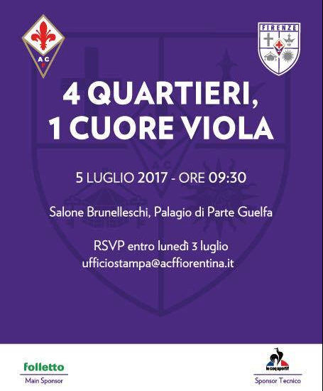 Mercoledì 5 luglio alle 9:30 presso il Palagio di Parte Guelfa sarà presentato alla stampa il concept della stagione “4 Quartieri, 1 Cuore Viola” e la nuova collezione di maglie della Fiorentina. Nel pomeriggio sono previste due sessioni di autografi presso il Fiorentina Store Stadio e il Fiorentina Store Duomo dove i calciatori viola incontreranno i tifosi per foto e autografi a partire dalle 19.30. A riportarlo è il canale ufficiale viola.