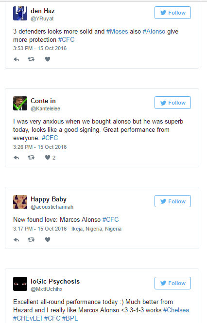 La prima dal 1′ in casa, e prestazione superba nel 3-0 al Leicester. Marcos Alonso si prende le copertine al Chelsea, e fa già innamorare i tifosi Blues. ‘Alonso è il nuovo Ashley Cole’, ‘Perfetto per il gioco di Conte’, le reazioni social dei sostenitori del Chelsea. Alonso primo nelle classifica fisiche, chilometri percorsi e sprint, nella gara contro il Leicester di Ranieri.