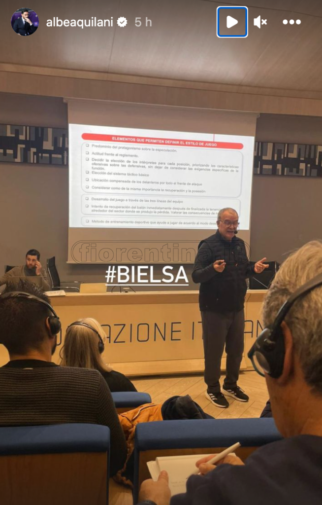 Marcelo Bielsa ha tenuto una lezione tattica oggi a Coverciano, per tutti gli allievi dei corsi per diventare Direttore Sportivo e allenatore Uefa Pro. Il corso lo sta seguendo anche l’allenatore della Fiorentina Primavera, Alberto Aquilani, che oggi ha assistito alla lezione del Loco Bielsa.