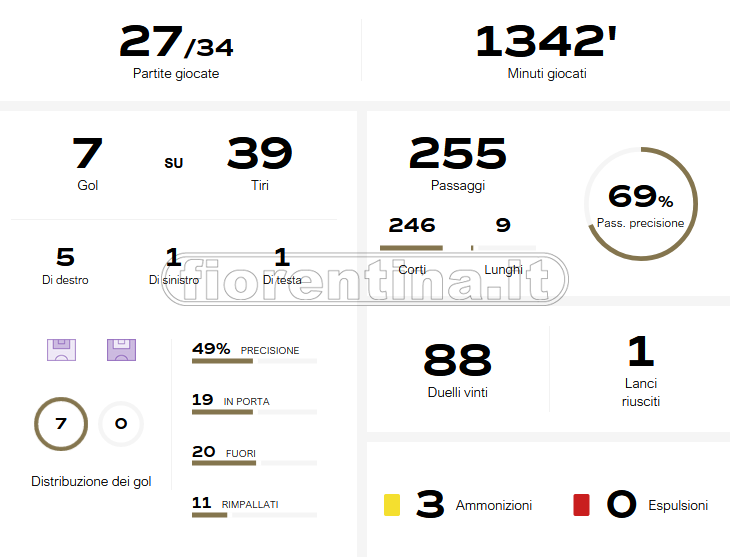 DIECI PER CENTO. Se si prende in esame il dato collettivo della Fiorentina, in Conference League ha messo a referto 232+21 conclusioni (considerando anche il preliminare) segnando 35 reti, mentre in Serie A ha segnato 45 gol tirando 547 volte. In Coppa Italia sono stati messi a referto 72 tiri, per 5 gol segnati. In totale, dunque, la Fiorentina ha effettuato 872 conclusioni segnando 85 reti. Il rapporto tiri/gol con cui viaggia la Fiorentina è del 9.8% di percentuale di realizzazione di media.
