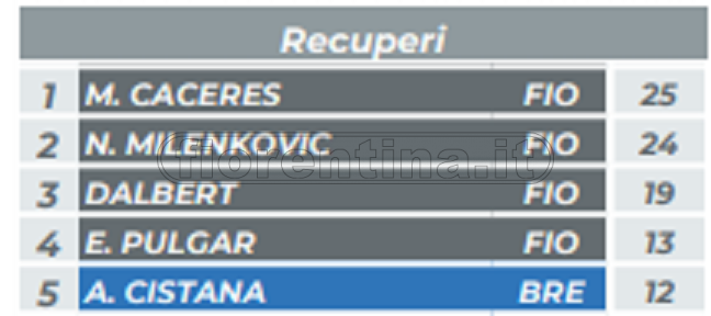 TALISMANO, E NUMERI RECORD E se in occasione del gol annullato ad Ayé dal Var qualcosa non ha funzionato, visto che in mezzo all’area erano in due i calciatori del Brescia soli, è altrettanto vero che anche contro le rondinelle Caceres non ha fatto passare se non qualche spiffero. Fin qui, nelle 6 partite giocate da quando è arrivato in viola, oltre ad essere un vero e proprio talismano dato che la squadra di Montella non ha mai perso ottenendo 3 vittorie e 3 pareggi, ha messo a referto 86 palloni recuperati, 27° dato assoluto (totale) della Serie A, che vuol dire oltre 14 di media. Pezzella e Milenkovic, che le hanno giocate tutte e 8, sono rispettivamente a 125 e 115, per una media di poco superiore proprio a quella dell’ex Juve. E l’ascesa di Caceres continua.