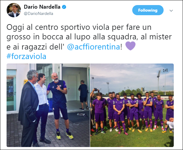 Sono stati il Vice Presidente Gino Salica e il tecnico Stefano Pioli ad accogliere oggi al centro sportivo il sindaco di Firenze, Dario Nardella. “Oggi al centro sportivo viola per fare un grosso in bocca al lupo alla squadra, al mister e ai ragazzi della Fiorentina! ? #forzaviola”, ha scritto Nardella via Twitter, postando poi anche due foto.