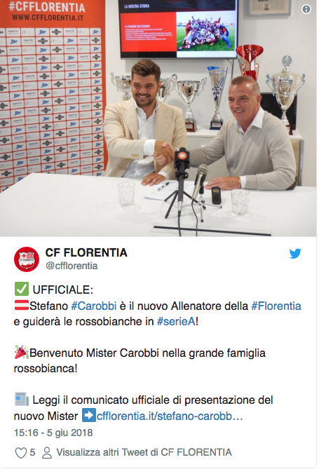 L’ex giocatore di Fiorentina e Milan, Stefano Carobbi, sarà il nuovo tecnico della neopromossa in Serie A femminile Florentia.