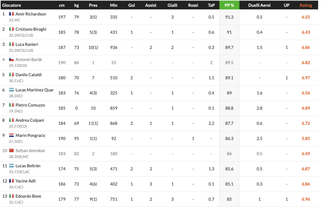 PRECISIONE. Non male neppure la capacità di effettuare passaggi precisi. Cataldi ha la seconda miglior percentuale tra i centrocampisti della Fiorentina: 89.1%, dietro solo a Richardson (91.3%). E’ quinto, invece, Bove con l’85% di passaggi completati. Numeri quindi in evidente crescita che mostrano come l’ambiente viola faccia bene ai due giocatori, e gettano le basi per discorsi concernenti l’eventuale riscatto di entrambi.