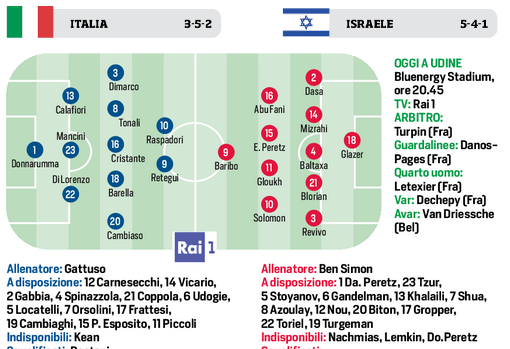 Italia in campo oggi contro Israele. Raspadori parte in vantaggio su Esposito. Gattuso cambia: 3-5-2, Piccoli in panchina