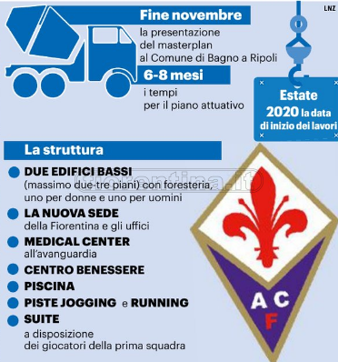 Si sofferma sul centro sportivo di Bagno a Ripoli La Nazione: cinquanta milioni di investimento, 25 ettari di terreno, con 10-12 campi da gioco di cui solamente tre illuminati con torri faro basse per non impattare sull’ambiente. Così come soltanto tre saranno i campi in erba sintetica. Il masterplan sarà presentato al Comune entro il 30 novembre: da qui a quella data proseguiranno i lavori di ripulitura dell’area per una stuttura in stile Barcellona, con foresterie e tutte le squadre giovanili e femminile che potranno vivere insieme la quotidianità.