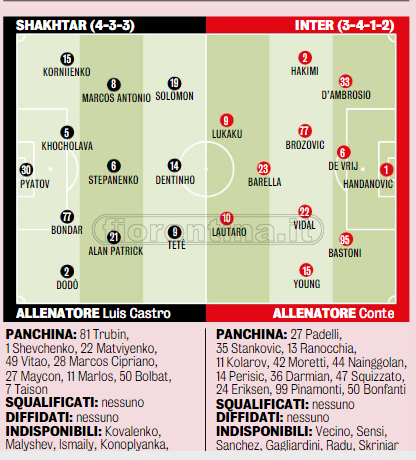 Calcio senza soste. E’ di nuovo serata di Champions League per le italiane. Per l’Inter è già determinante la sfida con gli ucraini dello Shakhtar Donetsk. La squadra di Conte non può sbagliare dopo il pari col Mönchengladbach. L’Atalanta riceve l’Ajax dopo la vittoria in Danimarca. Le probabili scelte delle gare delle italiane impegnate oggi: