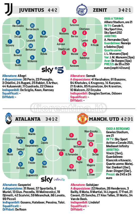 Riparte la Champions League, che per la quarta giornata della fase a gironi vede oggi impegnate Juventus e Atalanta. Per la squadra nerazzurra ci sarà a Bergamo la sfida con lo United di Ronaldo, mentre la squadra di Allegri, prossima avversaria della Fiorentina sabato a Torino, ci sarà lo Zenit. Queste le probabili formazioni delle due italiane impegnate oggi: