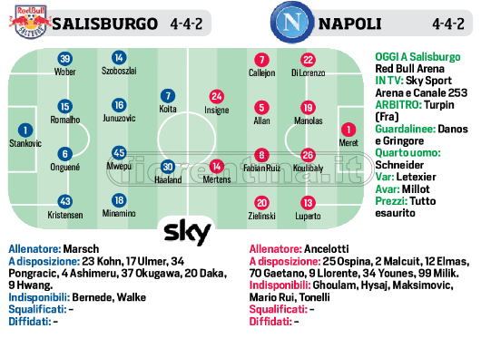 Dopo il successo in rimonta 2-1 contro la Lokomotiv della Juventus e il 5-1 subito da Gasperini con la sua Atalanta col City, oggi tocca al Napoli di Ancelotti e all’Inter di Conte. Per i partenopei c’è l’insidiosa trasferta col Salisburgo. Per l’Inter il Borussia Dortmund. Le probabili formazioni delle gare delle due italiane: