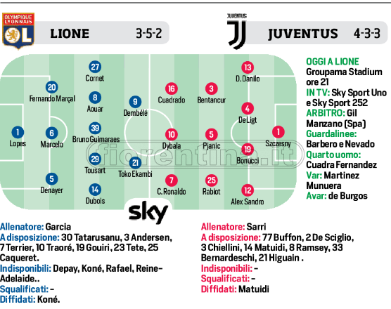 Pareggio per 1-1 per il Napoli di Gennaro Gattuso ieri in Champions League contro il Barcellona al San Paolo. Vittoria larga del Bayern che passa col Chelsea in trasferta 0-3. Oggi tocca alla Juventus di Maurizio Sarri, di scena a Lione. A Madrid si gioca anche Real-Manchester City. Le probabili formazioni: