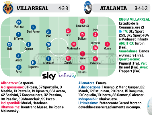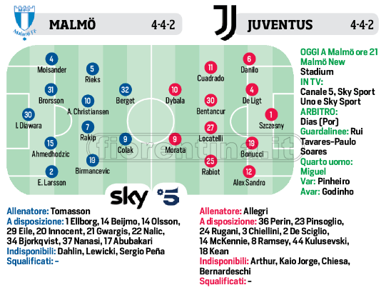 Tocca alla Juventus di Allegri e all’Atalanta di Gasperini aprire i gironi di Champions League per le italiane. Bianconeri senza diversi titolari impegnati in Svezia col Malmo, nerazzurri in Spagna contro il Villarreal. Queste le probabili scelte di formazione: