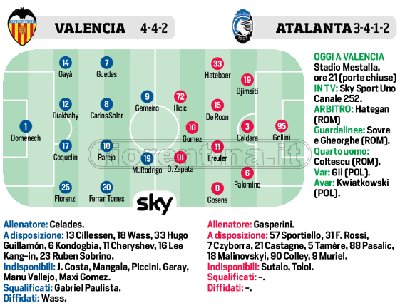 La Champions League non si ferma. L’Atalanta di Gian Piero Gasperini oggi affronta il Valencia, in Spagna, per la gara di ritorno degli ottavi. Al Mestalla si gioca a porte chiuse, con la Dea che riparte dal 4-1 ottenuto all’andata a San Siro. In campo anche Lipsia-Tottenham, con i tedeschi vincitori all’andata in trasferta 0-1. Queste le probabili scelte della gara dell’Atalanta: