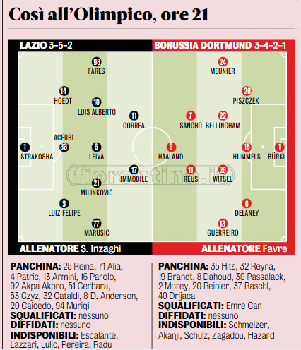 Serata di Champions League per due italiane. La Juventus affronta la Dinamo Kiev in trasferta, la Lazio il Borussia Dortmund. Queste le probabili scelte di formazione di Pirlo e Inzaghi: