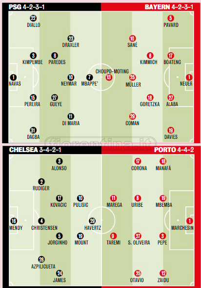 Serata di Champions League, oggi, con le gare di ritorno dei quarti di finale. Fuori tutte le italiane, con Psg-Bayern che ripartono dal 3-2 rimediato in Germania dai francesi all’andata. Il Chelsea, invece, riparte dal comodo 2-0 ottenuto in trasferta contro il Porto. In casa Real Madrid, invece, impegnato domani col Liverpool assieme a Dortmund–City, è allarme Covid-19. Positivi, oltre a Varane, anche Sergio Ramos. Queste le probabili formazioni delle partite di oggi: