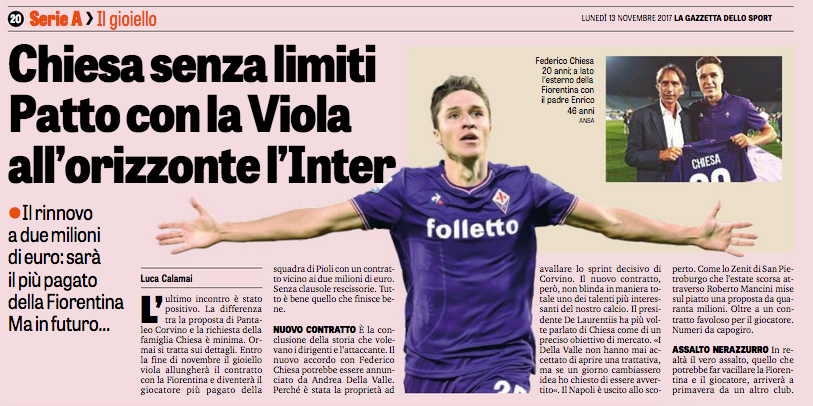 ASSALTO NERAZZURRO In realtà il vero assalto, quello che potrebbe far vacillare la Fiorentina e il giocatore, arriverà a primavera da un altro club. Spalletti e l’Inter considerano il giovane Federico una pedina chiave per il progetto di crescita nerazzurro. L’esterno d’attacco ideale per completare il reparto insieme a Perisic e Candreva. Tra l’altro Chiesa ha dimostrato di saper garantire un rendimento di alto profilo esibendosi su entrambe le fasce. Il diesse Ausilio da tempo ha cominciato a sondare il terreno per capire su quali basi lanciare l’attacco. L’Inter presenterà un’offerta vicino ai cinquanta milioni più un contratto di cinque anni all’attaccante con cifre ovviamente più alte rispetto a quelle che gli garantirà tra poche settimane la Fiorentina. I nerazzurri sperano di poter ridurre la parte in contanti inserendo una contropartita tecnica. Ma Ausilio è pronto anche a presentarsi a Corvino con tutti contanti.