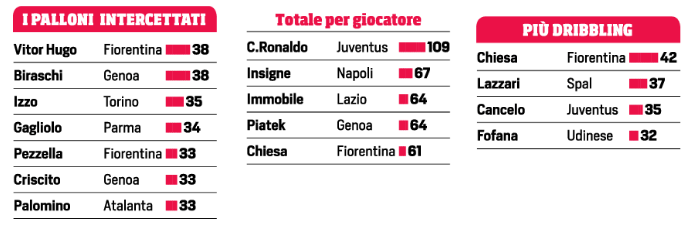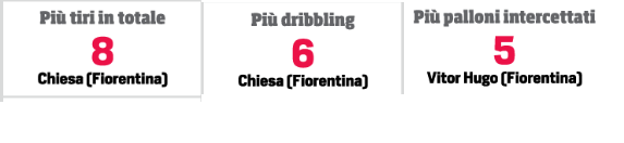 Nell’ultimo turno di Serie A ci sono due viola tra i recordman, il difensore Vitor Hugo, che ha intercettato più palloni di tutti i colleghi con 5 intercetti. E sale al primo posto assoluto con 38. Tra i top assoluti anche il collega di reparto Pezzella. Federico Chiesa è colui che ha effettuato più dribbling di tutti nell’ultima giornata, 6, confermandosi il calciatore che effettua più dribbling del campionato. Chiesa, tuttavia, è anche quello che ha tirato più di tutti con 8 conclusioni, senza però trovare neanche un gol. Ed i suoi tiri totali salgono a 61, per soli 2 gol messi a segno.