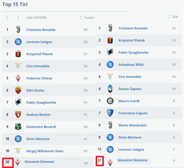 Giusto per fare degli esempi. Certo è inutile paragonare Simeone a Icardi che segna un gol ogni 4,2 tiri ed è a 9 centri, per non parlare di Mandzukic che ha segnato 8 gol tirando solo 20 volte, con una media di 1 gol ogni 2,5 tiri. Ma aspettarsi da Simeone dati migliori rispetto a quelli di Petagna, che ha segnato 6 reti tirando 40 volte con media realizzativa di 6,6, o di Caputo che ha segnato 9 gol in 37 tiri, uno ogni 4 conclusioni è più che lecito.