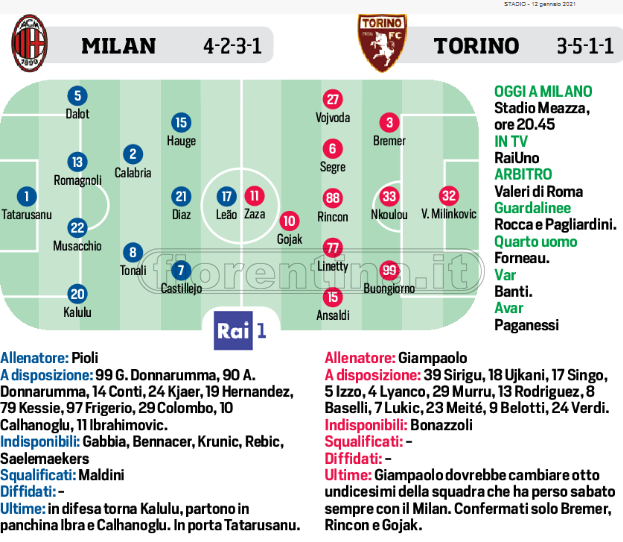 Pronti, via. Partono gli ottavi di finale di Coppa Italia. Oggi in campo, a San Siro, Milan e Torino. Ampio turnover annunciato nei rossoneri di Pioli, con Ibrahimovic e Calhanoglu che partiranno dalla panchina. Diversi cambi anche nei granata. Chi vince affronterà la vincente di Fiorentina-Inter, in campo domani sera al Franchi. Questi i probabili undici della sfida di San Siro: