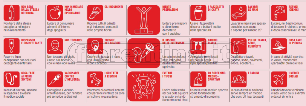 Diciotto regole, una dopo l’altra alle quali la Federazione medico-sportiva italiana, presieduta dal professor Maurizio Casasco, consigliere indipendente in Lega, ne ha aggiunte altre specifiche per i calciatori professionisti e per le persone a stretto contatto con essi, riportate dalla Gazzetta Dello Sport.