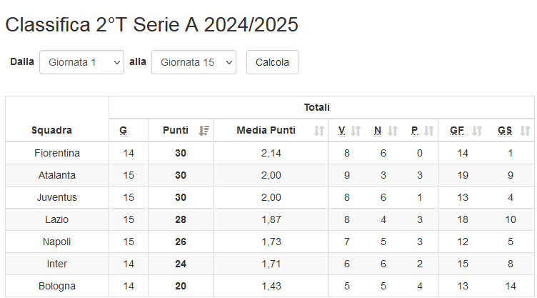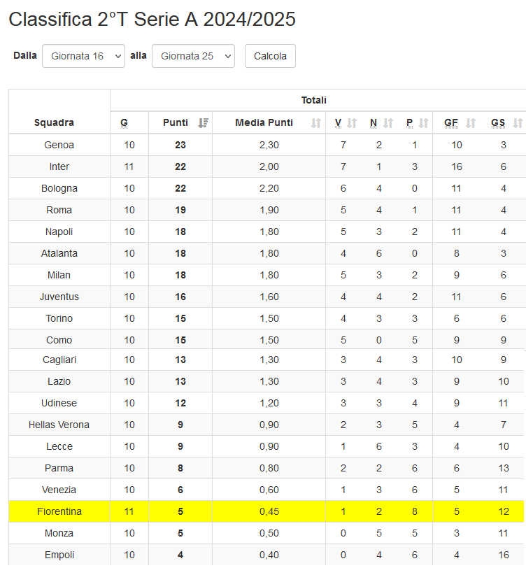 La Fiorentina avrebbe fatto solamente 5 punti se contassero solo le riprese, tra l’altro contro l’Inter nel recupero, unico secondo tempo chiuso con una vittoria considerando esclusivamente i secondi 45’ di partita (cioè come se nel secondo tempo si partisse sempre da 0-0).