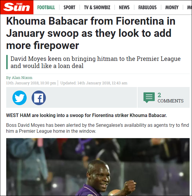 C’è anche il West Ham sulle tracce di Khouma Babacar. Gli agenti, scrive il Sun, starebbero valutando le possibili destinazioni per il senegalese in Premier League, e il manager degli Hammers Moyes avrebbe così messo gli occhi sull’attaccante viola. Davanti, infatti, il West Ham potrebbe salutare a breve almeno uno tra Javier Hernandez, Andy Carroll e Diafra Sakho: Babacar sarebbe un’opzione gradita per il West Ham, ma Moyes lo vorrebbe in prestito fino a giugno. La Fiorentina, invece, lo lascerebbe partire solo a titolo definitivo. Per il tabloid inglese, la richiesta viola si aggirerebbe sui 15 milioni di sterline.