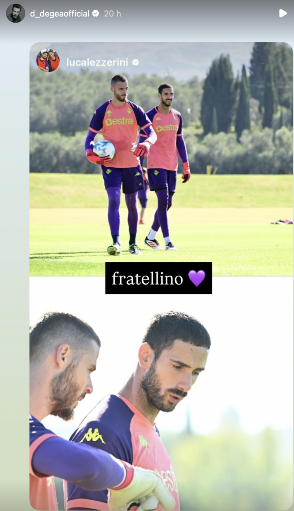 De Gea non solo ha ripostato la storia Instagram del compagno, ma ci ha aggiunto anche un “Fratellino“, con tanto di cuore viola che parla da solo. Si conferma il bel clima che c’è nel gruppo portieri viola, creato anche dai preparatori e che coinvolge lo stesso Martinelli, attualmente in Under 21.