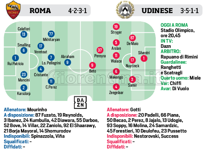 Come sottolinea il Corriere Dello Sport, il tecnico dei bianconeri ha parlato a lungo alla propria squadra, uscita scossa dal pesante ko contro il Napoli. Ci sarà un turnover caratterizzato da tre, forse quattro avvicendamenti, oggi, per il match coi giallorossi. I candidati a essere “sacrificati” nell’ambito del turn over sono Becao, Molina che sembra la brutta copia del giocatore ammirato sino a un mese fa, anche Deulofeu. Ma anche Pussetto dovrebbe partire dalla panchina, ecco perché alla fine ci dovrebbe essere spazio per Beto con Pereyra a rimorchio per attuare il 3-5-1-1. Questo il probabile undici dell’Udinese: