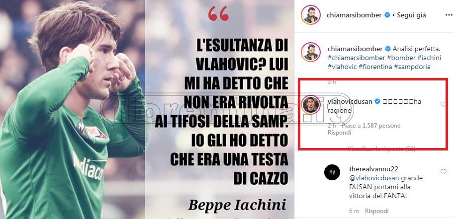 Ha fatto molto discutere l’esultanza di Dusan Vlahovic sotto la curva dei tifosi della Sampdoria. Lui stesso, nel post gara, ha spiegato che quella è una sua esultanza solita, e che non era assolutamente rivolta ai tifosi blucerchiati. E Iachini in sala stampa lo ha scherzosamente definito una “testa di c..”. Il serbo è tornato sopra l’argomento anche sui social: