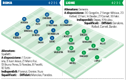 Cerca la rimonta disperata la Roma di Luciano Spalletti in Europa League. Dopo il 4-2 rimediato in Francia dal Lione i giallorossi, ultima squadra italiana rimasta in Europa assieme alla Juventus, affronteranno i francesi con questo probabile undici: