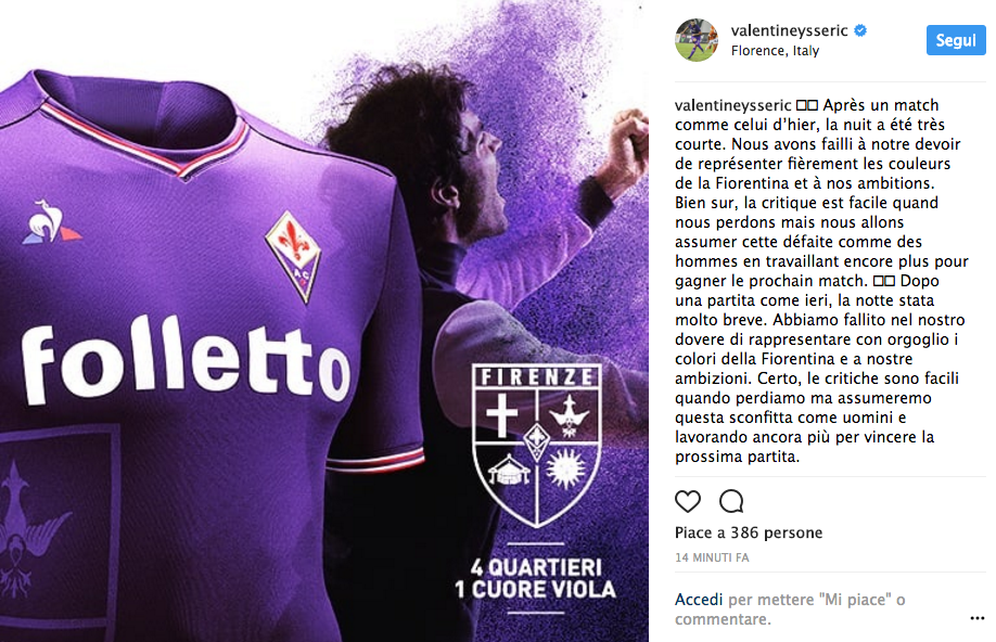 Il francese della Fiorentina, Valentin Eysseric, ha postato sul proprio profilo Instagram una foto ed il commento alla opaca prestazione sua e della squadra contro la Sampdoria. Questo il post pubblicato