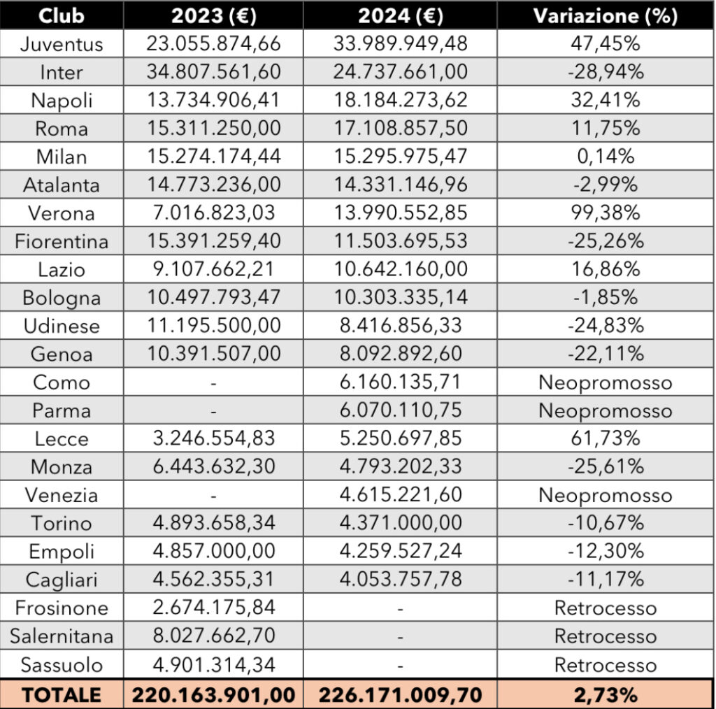 Entrando nel dettaglio, i club che hanno registrato una crescita nelle cifre spese per i procuratori rispetto al 2023 sono Juventus (+47,45%), Napoli (+32,41%), Lazio (+16,86%), Roma (+11,75%), Lecce (+61,73%) e Verona (+99,38%). Le società che hanno visto diminuire le cifre sono invece Inter (-28,94%), Fiorentina (-25,26%), Monza (-25,61%), Udinese (-24,83%) e Genoa (-22,11%). Nel dettaglio, ecco quanto ciascuna squadra ha corrisposto ai procuratori sportivi sotto forma di compensi, da chi ha versato di più a chi ha speso meno: