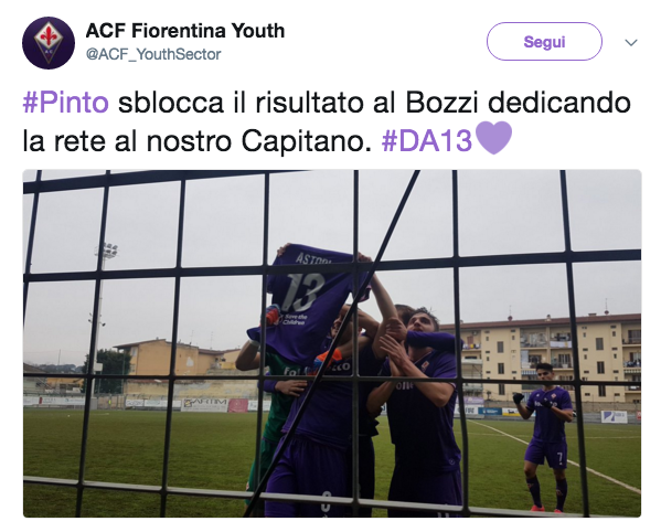 Dopo il gol del vantaggio della Fiorentina Primavera, il capitano viola Pierluigi Pinto è andato ad esultare nei pressi della panchina di Bigica dove ha mostrato la maglia di Davide Astori che recava la scritta “Sei la nostra luce, ciao capitano” a tutto il pubblico presente. Questa la foto apparsa sui social della società viola