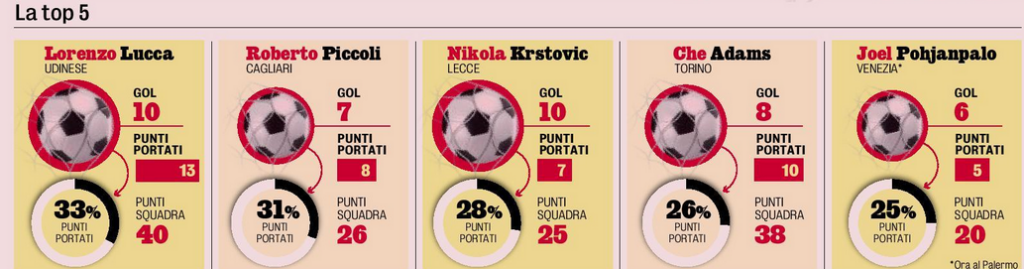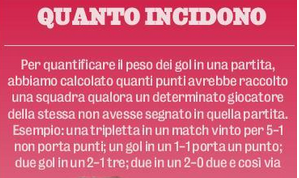 Si sofferma sul peso dei gol dei numeri nove delle varie squadre di Serie A la Gazzetta Dello Sport. Il dato tiene conto di quanti punti abbiano portato alle rispettive squadre le punte.