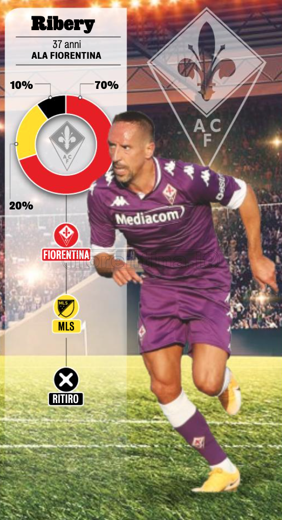 Secondo la rosea, Franck Ribery dovrebbe restare alla Fiorentina anche il prossimo anno. Nello specchietto dedicato al campione francese, viene data la permanenza al 70%. Il 20% è rappresentato da un’avventura in MLS, mentre c’è anche una piccola percentuale (10%) legata al ritiro.