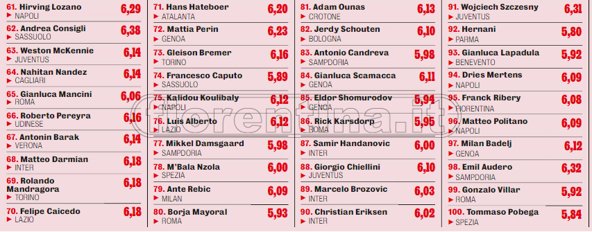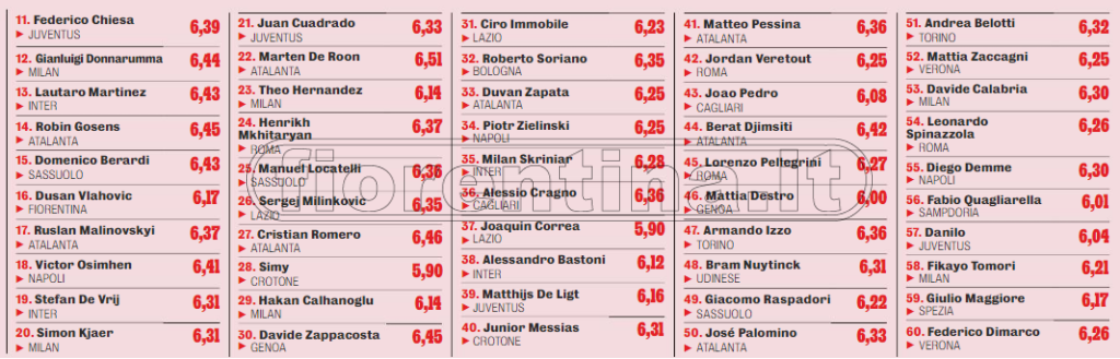 Analizza i rendimenti migliori dei giocatori del campionato di Serie A appena concluso la Gazzetta dello Sport. Nelle valutazioni della rosea, svettano Lukaku, Kessie, Ronaldo, Muriel, Barella, De Paul, Ibrahimovic, Insigne, Hakimi, Freuler. Presenti nella top 100 solo Vlahovic e Ribery, per quanto riguarda la Fiorentina.