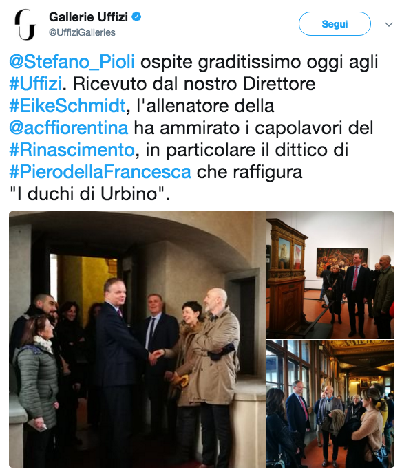 Giornata culturale per il tecnico della Fiorentina Stefano Pioli che nella giornata di oggi ha scelto di visitare la Galleria degli Uffizi. A fare da guida il direttore del museo Eike Schimdt. Come riportato nel tweet, il tecnico ha ammirato in particolar modo le opere di Piero Della Francesca. Inoltre, Stefano Pioli ha visitato la basilica di San Lorenzo e il complesso mediceo-laurenziano. L’allenatore ha ammirato in particolare i pulpiti di Donatello, la Sacrestia vecchia, la Tribuna di Michelangelo, e gli altri capolavori ospitati nella Basilica dei Medici. Di seguito le foto: