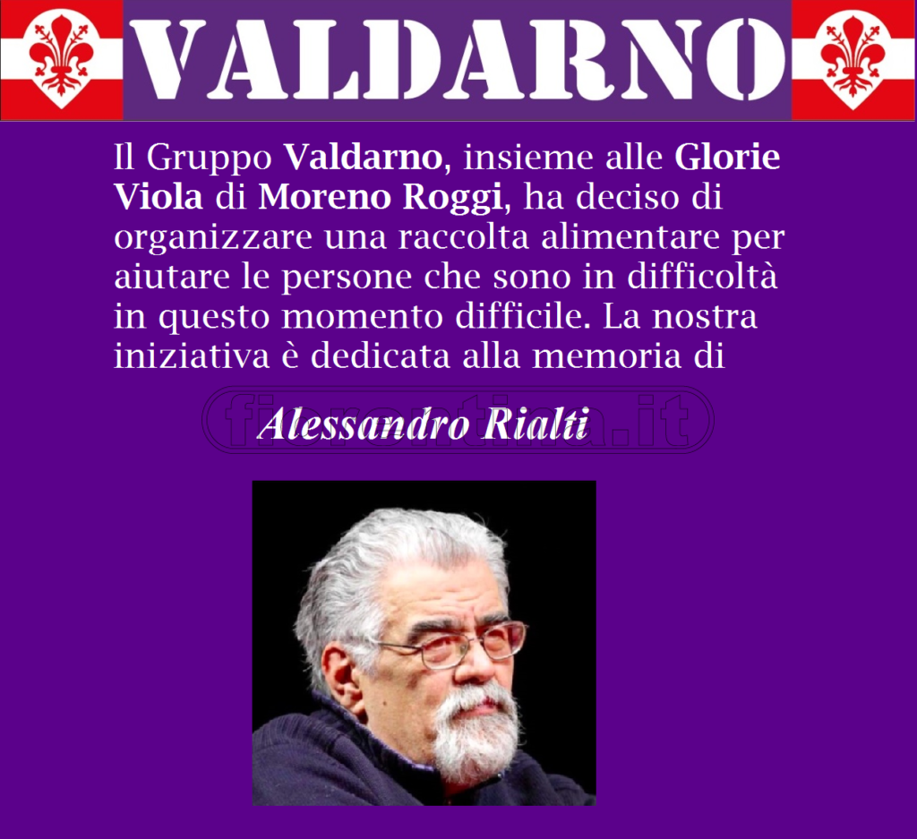 Attraverso i propri canali social, il Gruppo Valdarno ha annunciato l’organizzazione di una raccolta alimentare per aiutare le persone che sono in difficoltà in questo momento difficile. L’iniziativa, portata avanti insieme alle Glorie Viola di Moreno Roggi, è stata dedicata alla memoria del giornalista Alessandro Rialti, scomparso nelle scorse settimane.