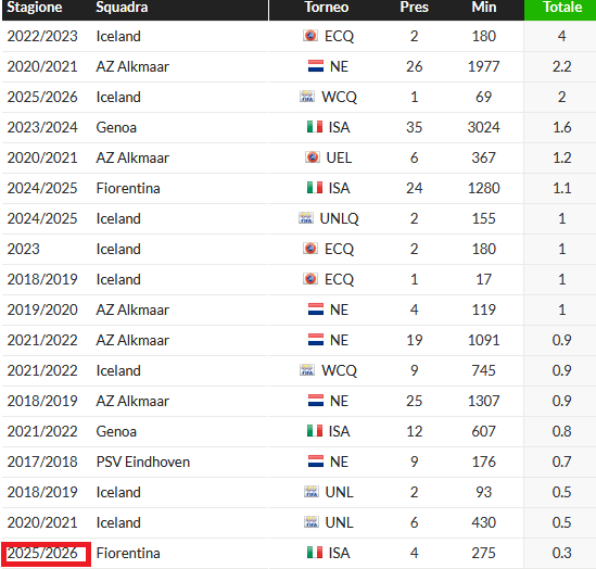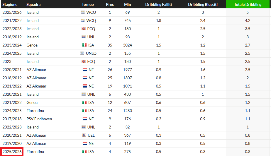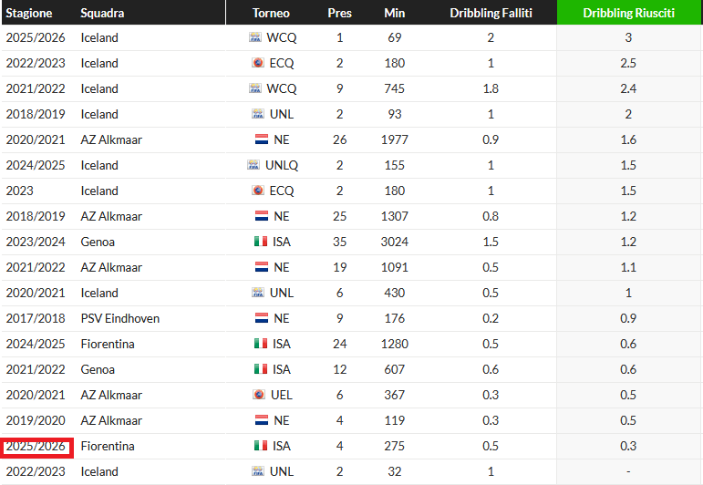 L’islandese ha messo a referto un numero di dribbling tentati a partita tra i più bassi della sua carriera. Già l’anno scorso erano lontanissimi dai valori che aveva espresso nell’anno precedente all’arrivo a Firenze. Va da sé come sia tra i più bassi anche il valore medio di dribbling riusciti a partita.