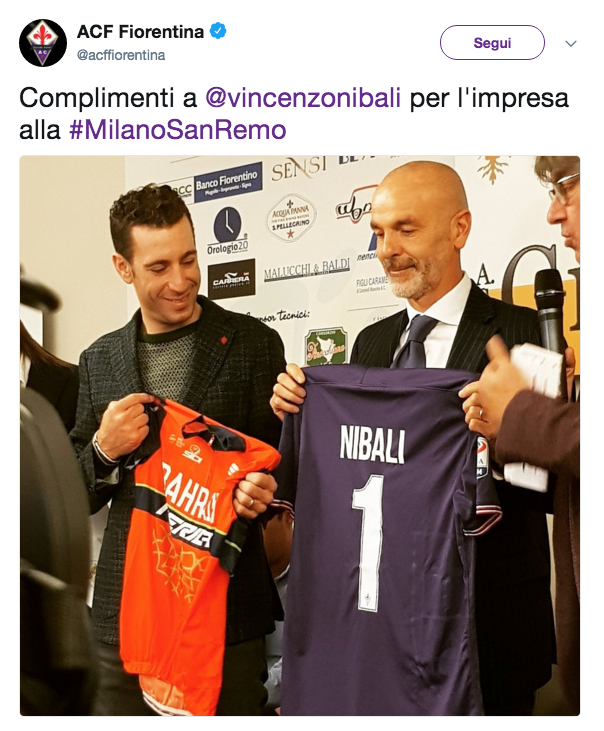 Dopo la vittoria nella Milano-Sanremo, a Vincenzo Nibali arrivano anche i complimenti social da parte della Fiorentina. Qui sotto il tweet pubblicato dalla società viola: