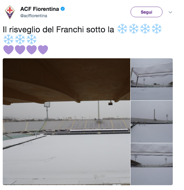Come previsto a Firenze è nevicato abbondantemente. Sul profilo Twitter della Fiorentina è stata pubblicata anche qualche foto che ritrae il campo del Franchi ricoperto dalla neve