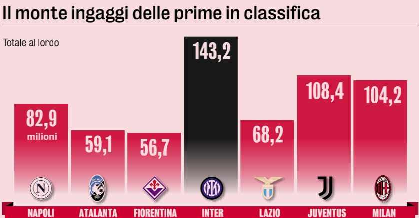 L’Inter spende più di Napoli (83 milioni), Juventus (108,4) e Milan (104,2), per restare alle big (in rigoroso ordine di classifica). Notevole anche il gap con squadre come Fiorentina e Atalanta, che comunque sono lì, in classifica, nel gruppone che sta lottando per le primissime posizioni in Serie A.