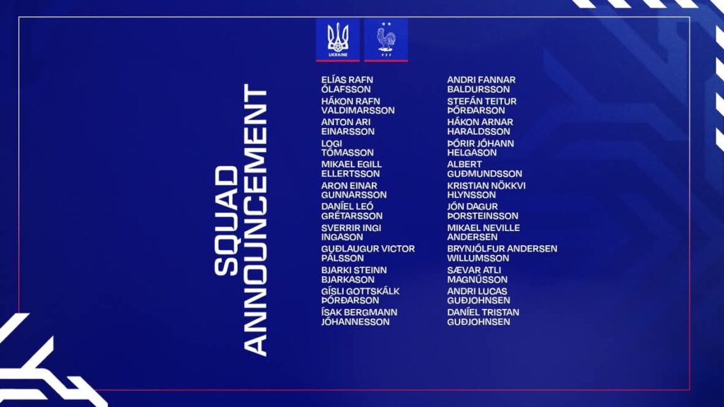 Il ct dell’Islanda, Arnar Gunnlaugsson ha diramato la lista dei convocati per le partite contro Ucraina e Francia, valide per le qualificazioni alla Coppa del Mondo 2026. L’Islanda affronterà l’Ucraina venerdì 10 ottobre alle 18:45 e la Francia lunedì 13 ottobre alle 18:45. Entrambe le partite si giocheranno a Laugardalsvöllur.