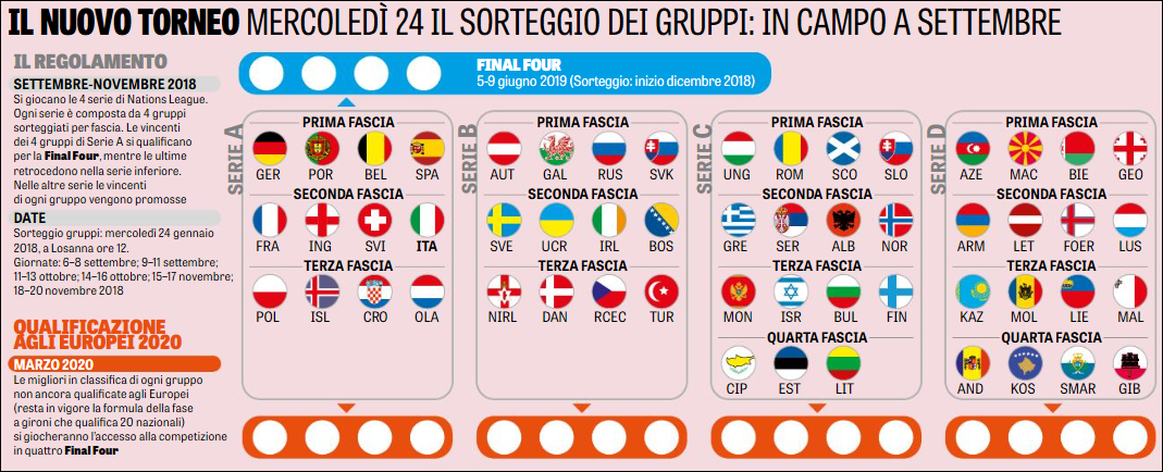 La Nations sembra un torneo affascinante, veloce, ma un po’ complicato. «Se sgombriamo il campo dai pregiudizi, non è così complicato. Le 55 nazionali europee sono divise in 4 serie. In ogni serie ci sono 4 gruppi. Le vincenti dei 4 gruppi sono promosse, le perdenti retrocedono. Infine, le 4 vincenti dei gruppi del primo livello si giocano il torneo in una final four».