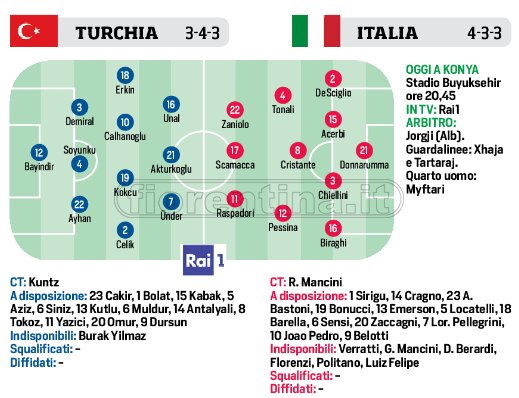 Italia, oggi c’è la Turchia in una gara che mette in palio solo punti per il Ranking. In campo dal 1′ il viola Biraghi. La probabile formazione, con tante defezioni negli azzurri