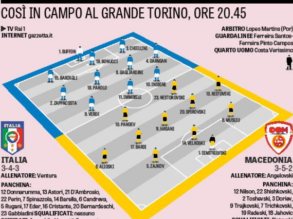 Possibile variazione di modulo per l’Italia di Ventura che stasera proverà a chiudere il discorso qualificazione allo spareggio per il prossimo Mondiale affrontando a Torino la Macedonia. 3-4-3 per gli azzurri con Buffon in porta, Barzagli, Bonucci, Chiellini dietro, Zappacosta e Darmian sulle corsie esterne con Parolo e Gagliardini in mediana, Verdi, Immobile e Insigne davanti.