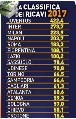 Più volte lo ha sottolineato come la sfida tra Napoli e Juventus sia una lotta impari Maurizio Sarri. Ed in vista del match scudetto dello Stadium, il Qs torna proprio su bilanci e ricavi dei club di Serie A. La Juventus vola doppiando quasi tutti con i suoi oltre 422 milioni di ricavi. La Fiorentina è sesta con 108 milioni, ottenendo più ricavi della Lazio, che però è davanti in classifica e come rosa.