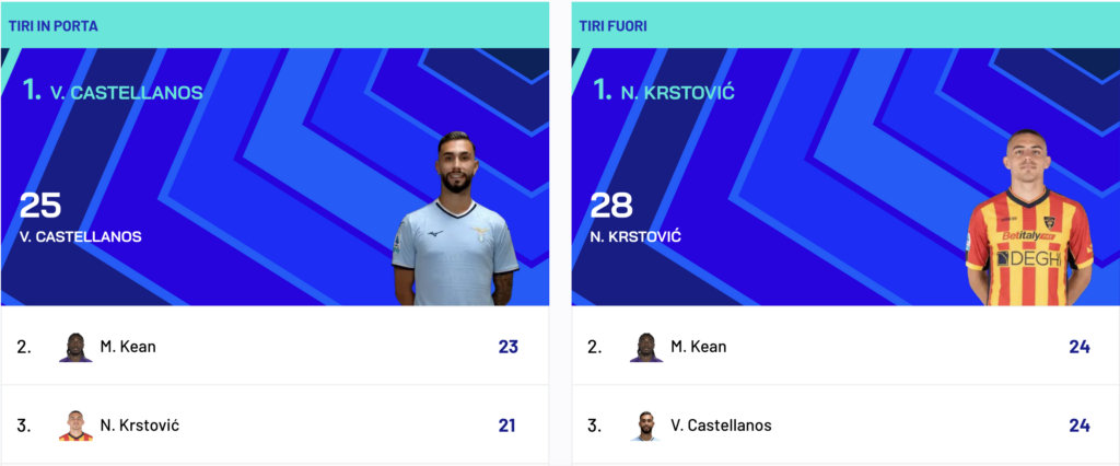 TIRI. Kean è terzo nella classifica goleador di questa Serie A a quota 10 reti, dietro a Thuram e Retegui entrambi a 12. Inoltre, l’attaccante gigliato è secondo nella speciale classifica che considera i tiri effettuati verso e fuori dallo specchio della porta: 23 i tiri in porta, uno in più (24) quelli fuori. Infine, sempre per quanto concerne le statistiche al tiro, è il calciatore che ha colpito più pali/traverse del nostro campionato. Sono stati infatti 3 i legni colpiti da Kean nelle apparizioni in maglia viola nel nostro campionato.