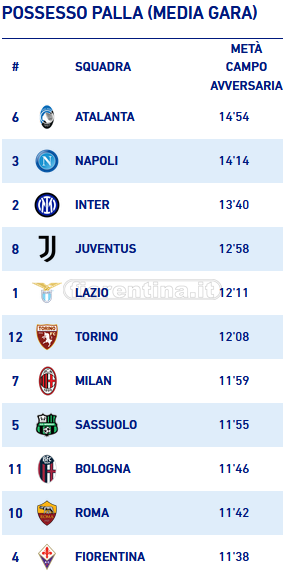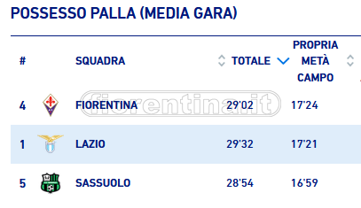 La Fiorentina 2021-22 ha chiuso il girone d’andata al secondo posto assoluto per percentuale di possesso e al quarto assoluto per minutaggio di possesso.