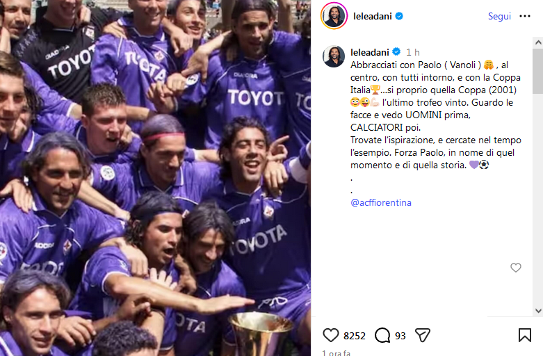 Celebra così il ritorno alla Fiorentina di Paolo Vanoli (stavolta da allenatore) l’ex compagno di squadra ai tempi di Firenze Lele Adani: