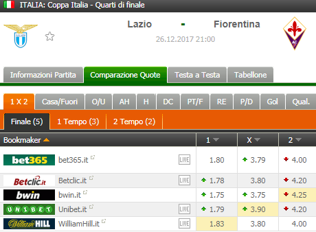 Padroni di casa della Lazio favoriti per le quote martedì. Ma non troppo. La vittoria al 90′ della Fiorentina paga oltre 4 volte la posta.